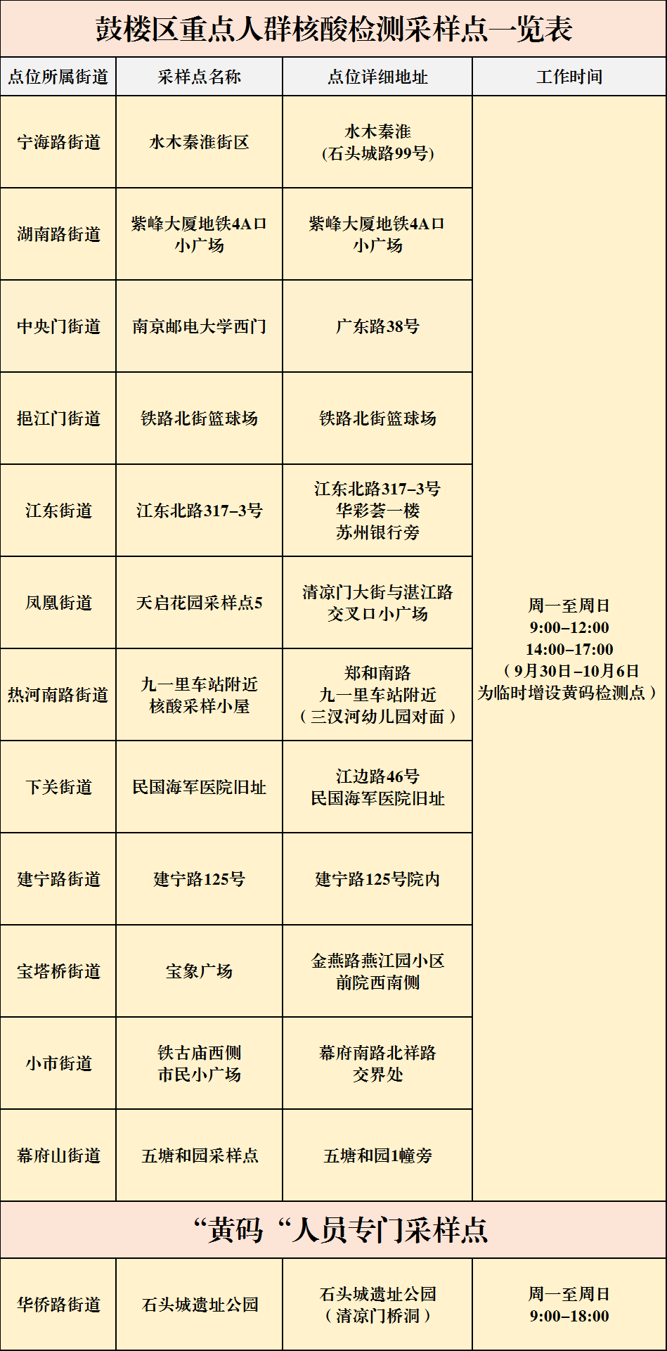 南京市鼓楼区重点人群核酸检测采样点位(含黄码人员)