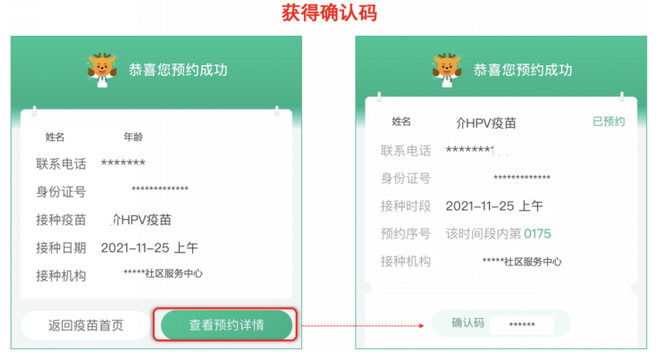 4:预约成功后,点击“查看预约详情”,获得确认码,之后请携带相关证件,按预约时间准时前往接种点接种。