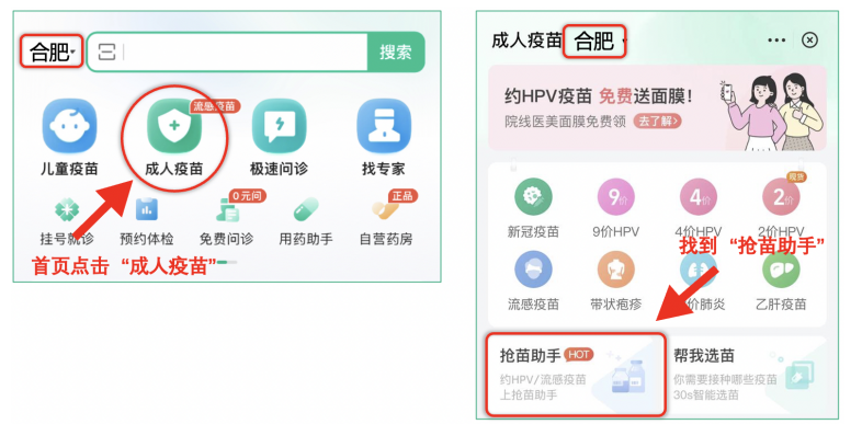 2:医鹿APP首页。选择“合肥”地区,点击医鹿App首页“成人疫苗”,进入页面后点击“抢苗助手”进入抢苗助手页面。