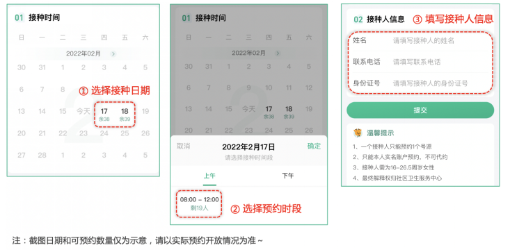 3.填写预约信息。选择接种日期和时间,填写接种人信息,系统会在线核实是否符合疫苗接种条件,是否本人实名账户,只有符合条件的用户才可进行预约。