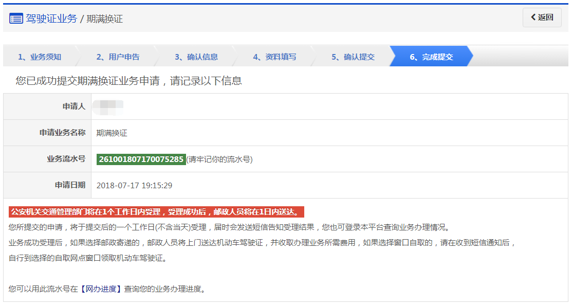 该步骤提交成功后,系统生成业务流水号。该步骤提交成功后,系统将于提交后的一个工作日(不含当天)受理(选择在线支付的业务费用支付完成后受理),届时会发送短信告知受理结果。用户可以根据该业务流水号在网办进度中查询业务办理进度。