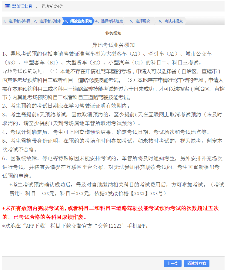 在该步骤,用户需认真阅读考试预约业务须知,在阅读完毕后,点击【阅读并同意】进入步骤4【选择考试地点】。