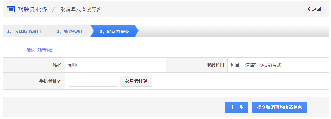 步骤3:【确认并提交】返回该步骤显示用户的信息,再次确认信息以后,点击【获取验证码】,系统会发送6位验证码到用户绑定的手机,用户输入手机验证码后,点击【提交取消预约申请信息】,完成取消预约业务办理。
