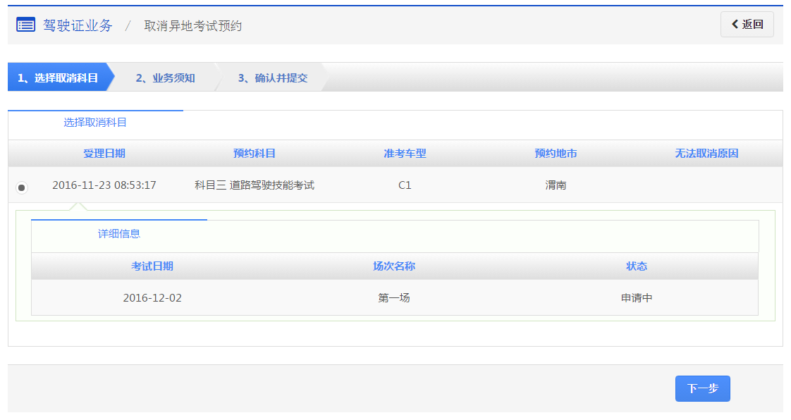 在该步骤,会显示用户的基本信息,用户需选择考试科目,点击【下一步】进入步骤2【选择考试地市】。