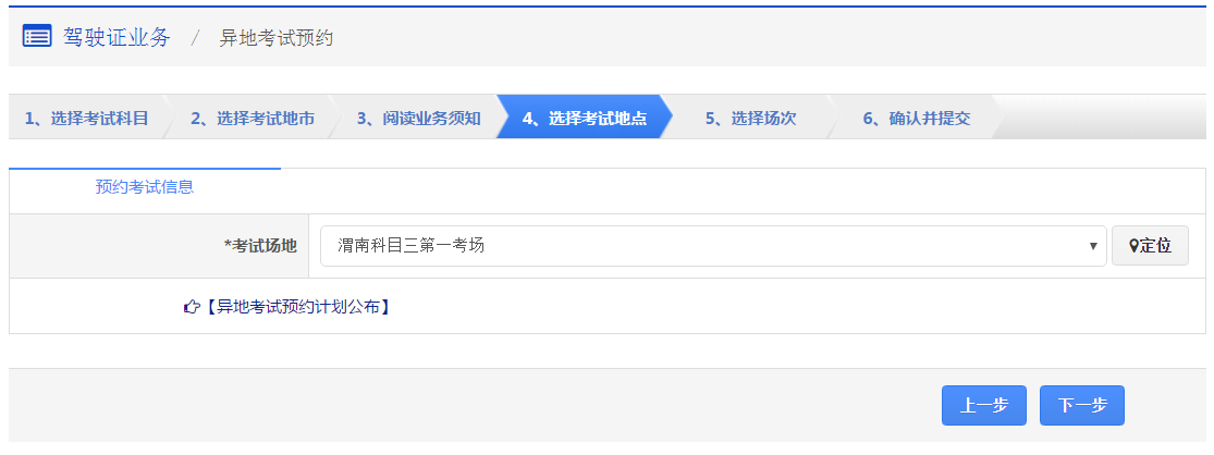 在该步骤,用户需选择考试场地,点击【下一步】进入步骤5【选择场次】。
