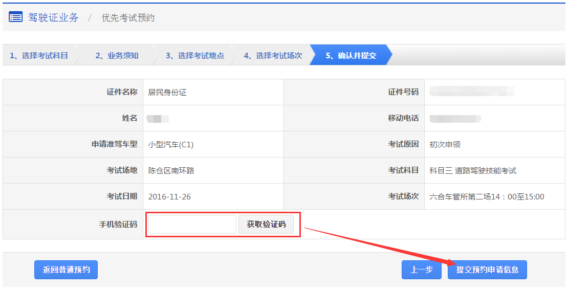 该步骤显示用户的预约信息,再次确认信息以后,点击【获取验证码】,系统会发送6位验证码到用户绑定的手机,用户输入手机验证码后,点击【提交预约申请信息】完成考试预约。