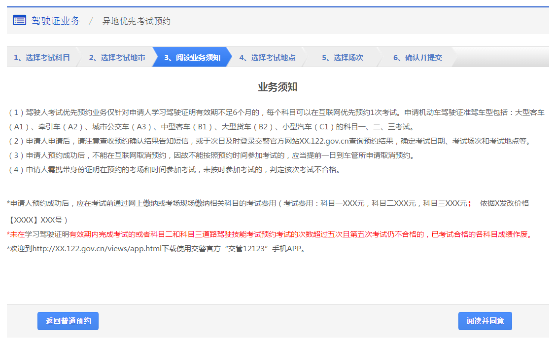 在该步骤,用户需认真阅读考试预约业务须知,在阅读完毕后,点击【阅读并同意】进入步骤4【选择考试地点】。