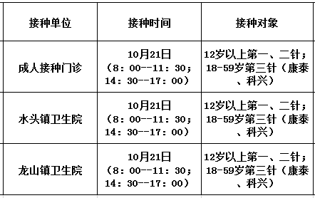 10月21日,佛冈县开放新冠病毒疫苗接种门诊有: