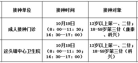10月19日,我县开放新冠病毒疫苗接种门诊有: