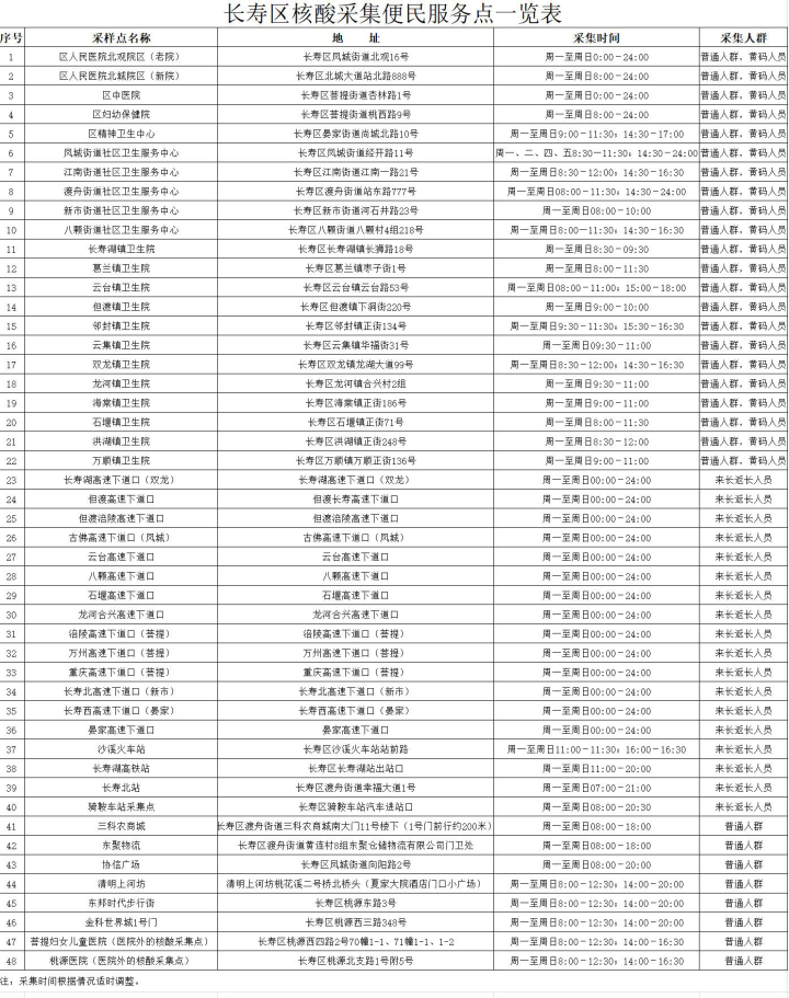 为同时满足广大市民朋友体育锻炼和新冠病毒核酸检测需求,决定撤销体育中心核酸采集便民服务点(地址:长寿区文苑西路2号),设立清明上河坊核酸采集便民服务点(地址:清明上河坊桃花溪二号桥北桥头夏家大院酒店门口小广场)。调整后,长寿区核酸采集便民服务点仍为48个,具体地址和采集时间详见附表。
