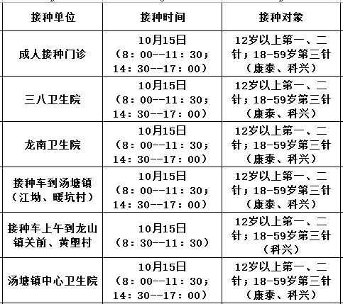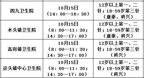 10月15日,佛冈县开放新冠病毒疫苗接种门诊有: