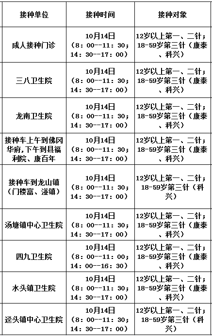 10月14日,佛冈县开放新冠病毒疫苗接种门诊有: