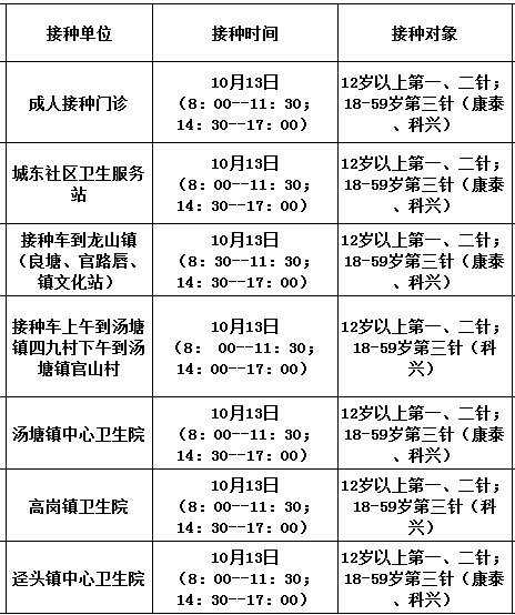 10月13日,佛冈县开放新冠病毒疫苗接种门诊有: