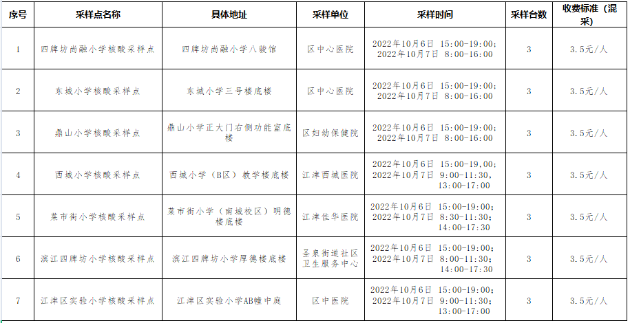 为保障全区中小学顺利开学,根据广大市民朋友的核酸采集需求,我区于10月6日-10月7日在四牌坊尚融小学、东城小学、鼎山小学、西城小学(B区)、菜市街小学(南城校区)、滨江四牌坊小学、江津区实验小学共增设7个临时便民核酸采样点,21个采样台,具体开放时间可见下表。请广大市民朋友们合理安排时间,就近就便进行核酸采集。