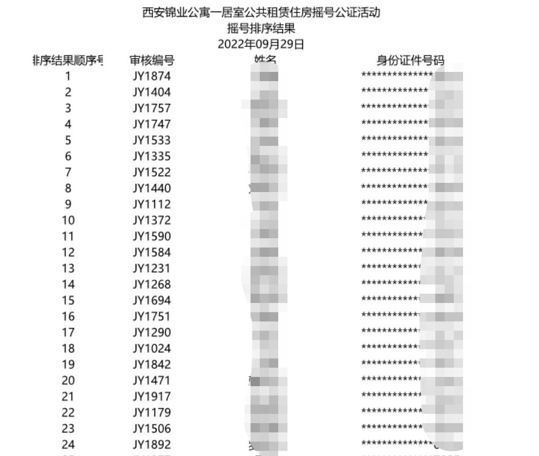 西安市公证处于2022年9月29日对锦业公寓公共租赁住房房源选房摇号排序进行了现场监督公证。摇号采用电脑摇号方式,使用西安市公证处摇号专用电脑、摇号专用软件,现场按照户型摇出申请人选房排序号,申请人按照排序号依次进行选房。现对锦业公寓公共租赁住房房源选房摇号排序结果予以公示。