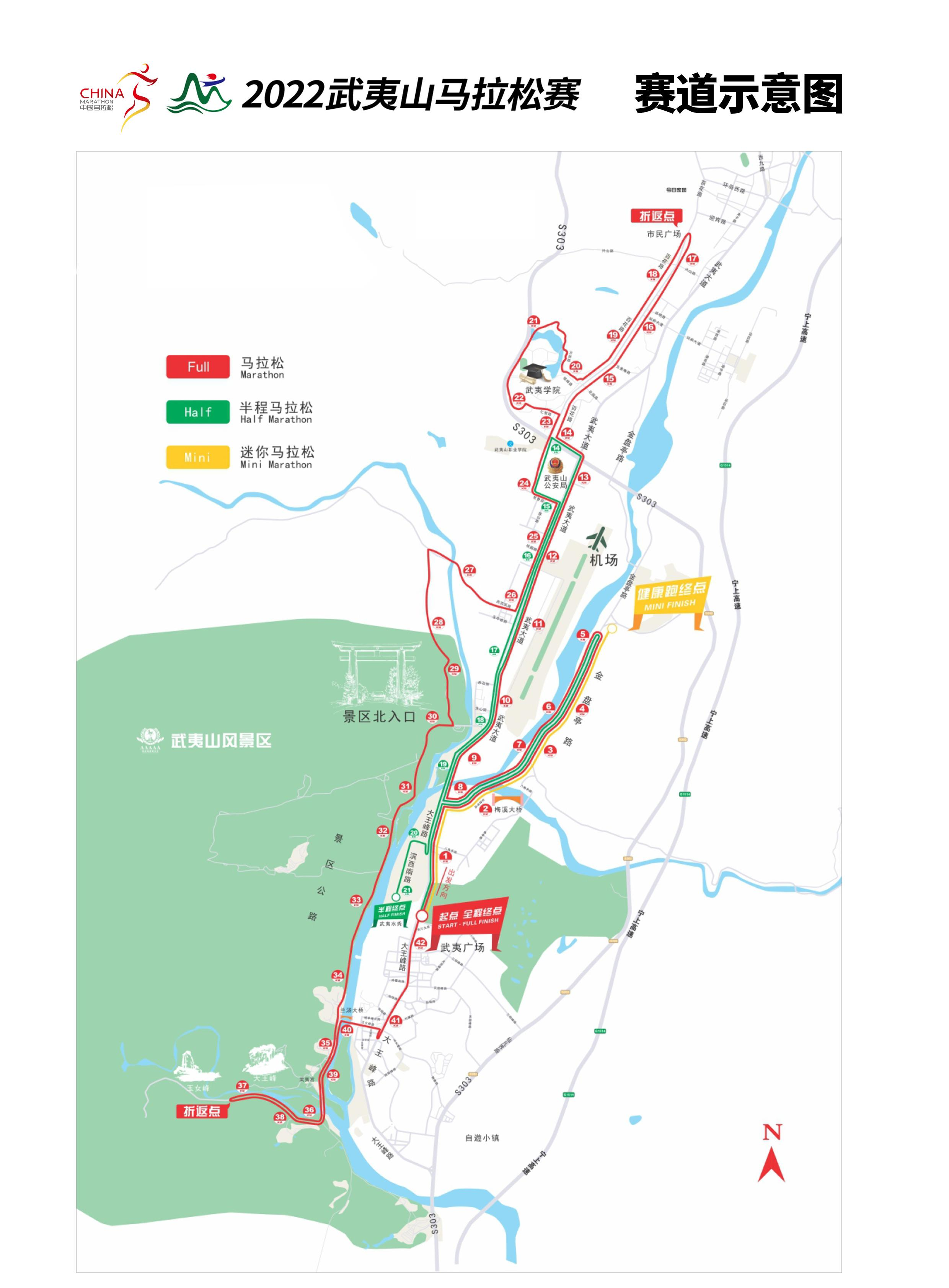 马拉松:武夷广场(起点)→大王峰路→滨溪东路→梅溪大桥→金盘亭路→武夷山高速路口红绿灯(折返)→金盘亭路→梅溪大桥→滨溪东路→武夷大道→省道303→百花路→市民广场(折返)→百花路→武夷学院东门→瑞樟路→云谷路→仁智路→武夷学院南门→百花路→茗香路→武夷大道→高苏坂→高新公路→桂高公路→桂星公路→武夷宫→景区二曲玉女峰处(折返)→武夷宫→桂星公路→兰汤大桥→玉女峰路→大王峰路→(折返)→大王峰路→武夷广场(终点)