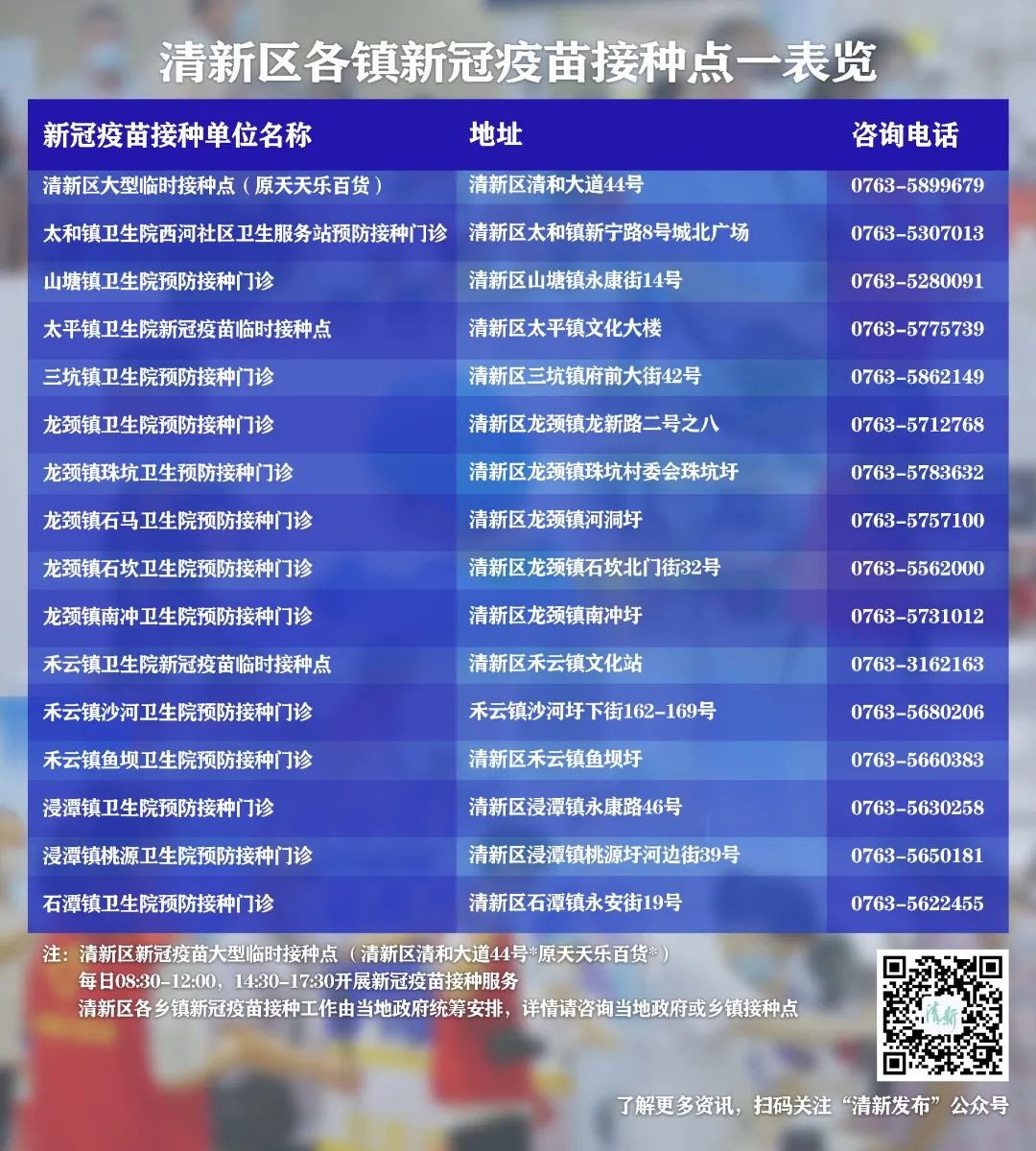 9月7日,清新城区及各乡镇均开放12岁及以上全人群第一针、第二针接种。