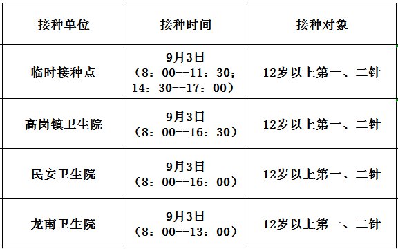 9月3日,佛冈县开放新冠病毒疫苗接种门诊有: