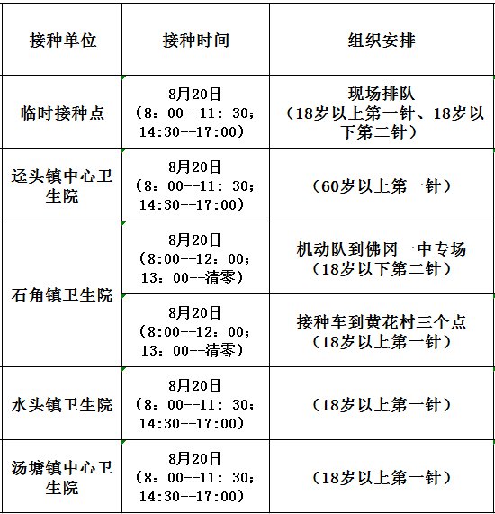8月20日,佛冈县开放新冠病毒疫苗接种门诊有: