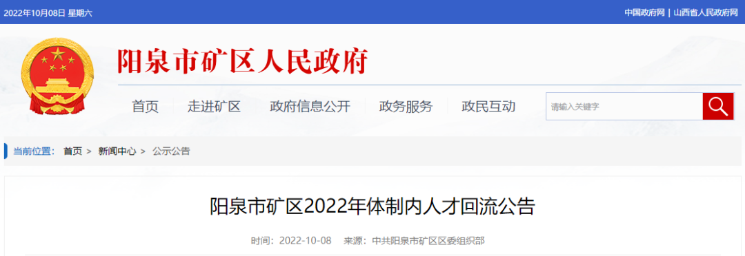 阳泉市矿区2022年体制内人才回流公告