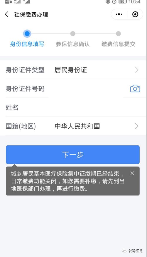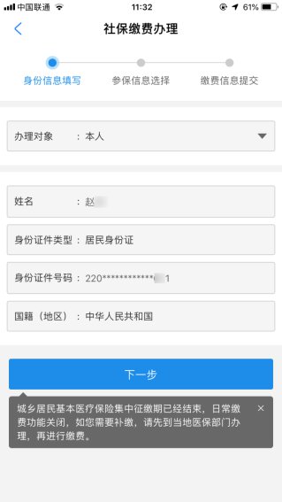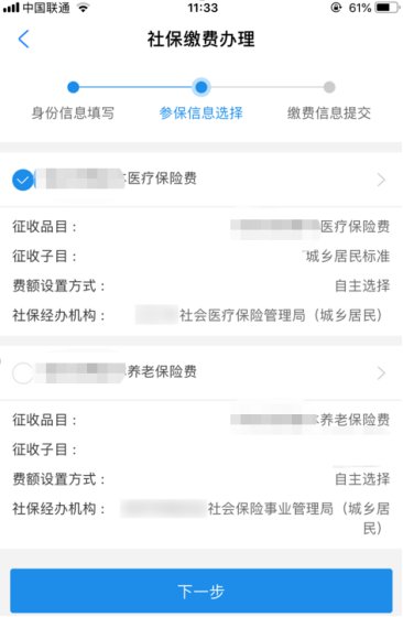 在信息填写页面,若为本人缴费,可直接选择“下一步”: