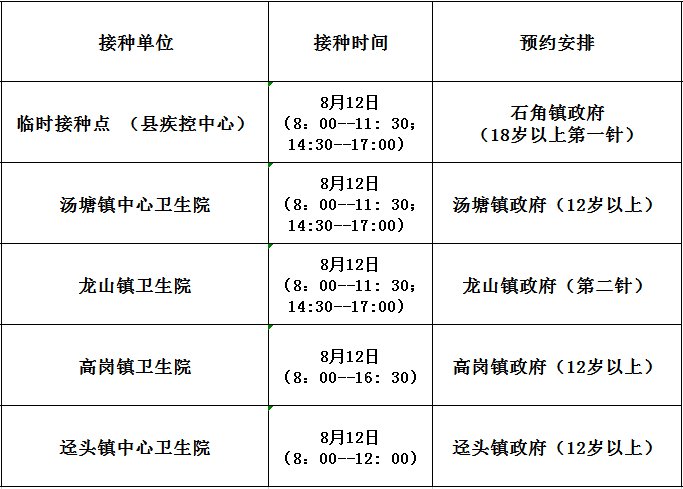8月12日开放门诊接种信息