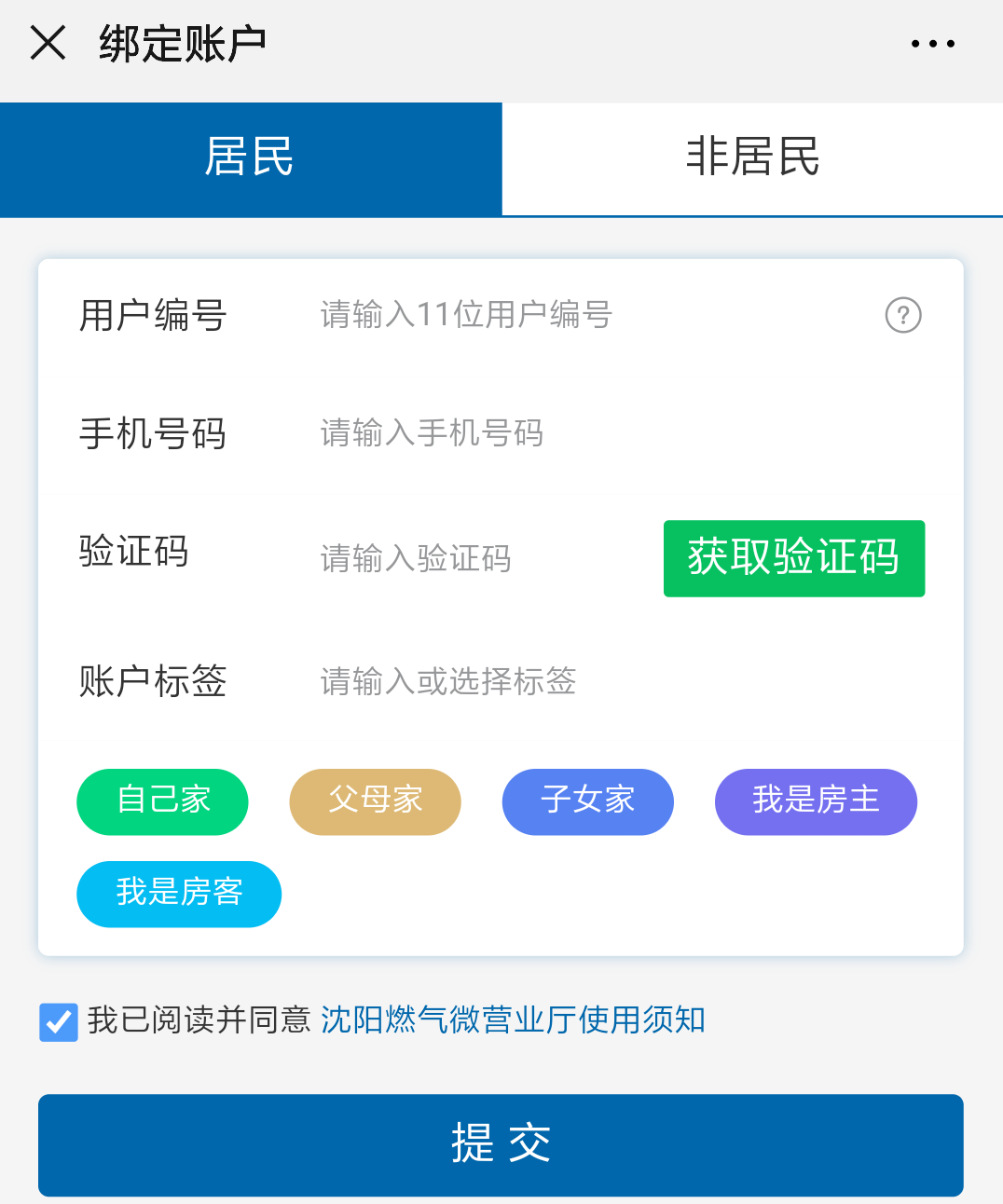 2、输入用户编号、可以收到短信的手机号码,获取验证码后填写收到的短信验证码。输入或选择“账户标签”,方便在绑定多个账户后切换账户,方便管理。非居民用户绑定时选择“非居民”,操作方法相同。