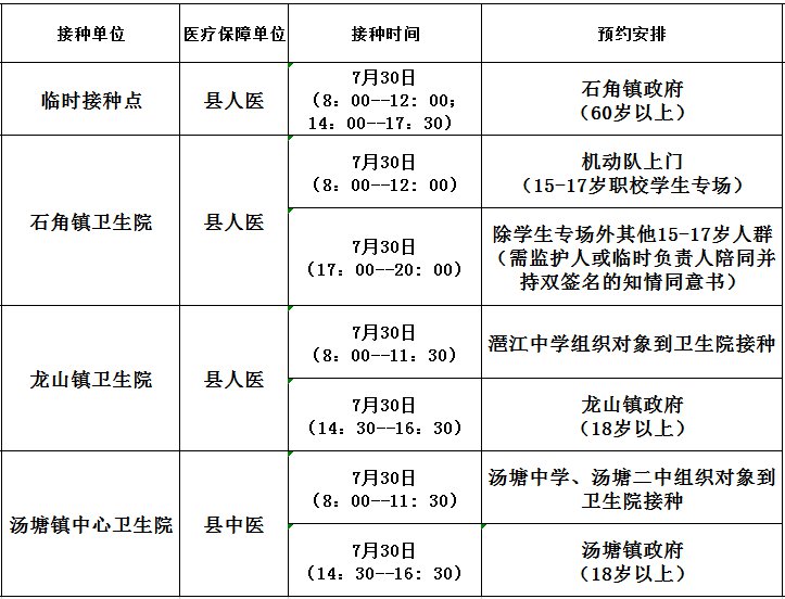 特别提醒:7月30日在职校、龙山镇卫生院(8:00-11:30)、汤塘镇中心卫生院(8:00-11:30)开展学生(15-17岁)接种专场,除学生专场外的15-17岁人员在监护人或临时负责人陪同下并持双签名的知情同意书前往石角镇卫生院(开诊时间为17:00-20:00)接种。