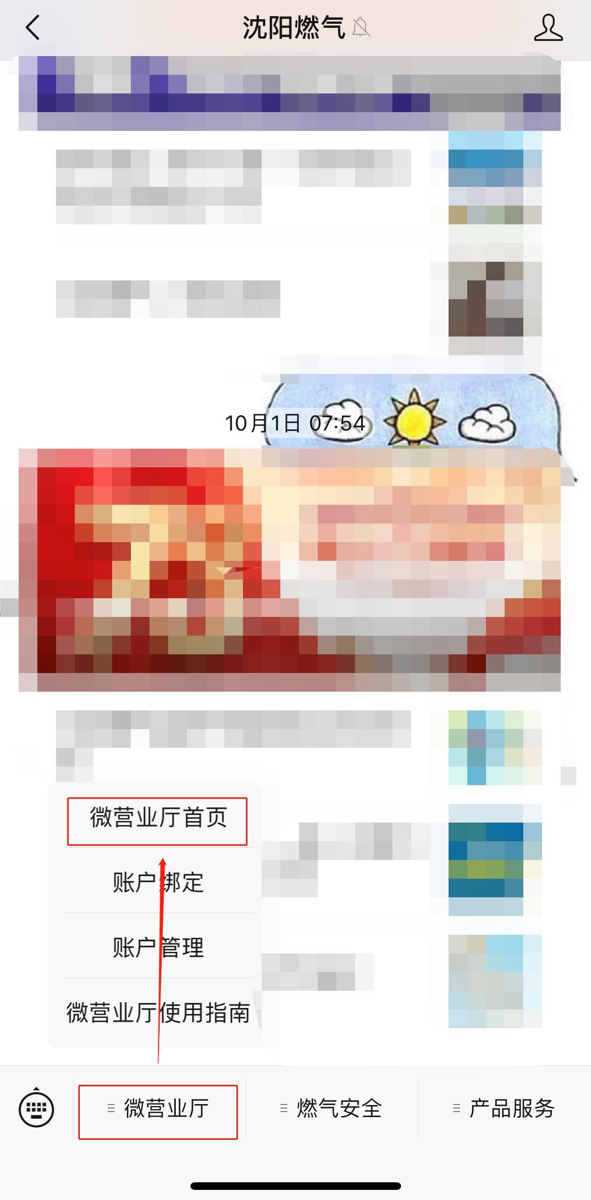1、关注“沈阳燃气”微信公众号,点击底部菜单栏“微营业厅”,再点击首页的“账单查询”按钮进入账单页面。