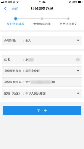 在信息填写页面,若为本人缴费,可直接选择“下一步”: