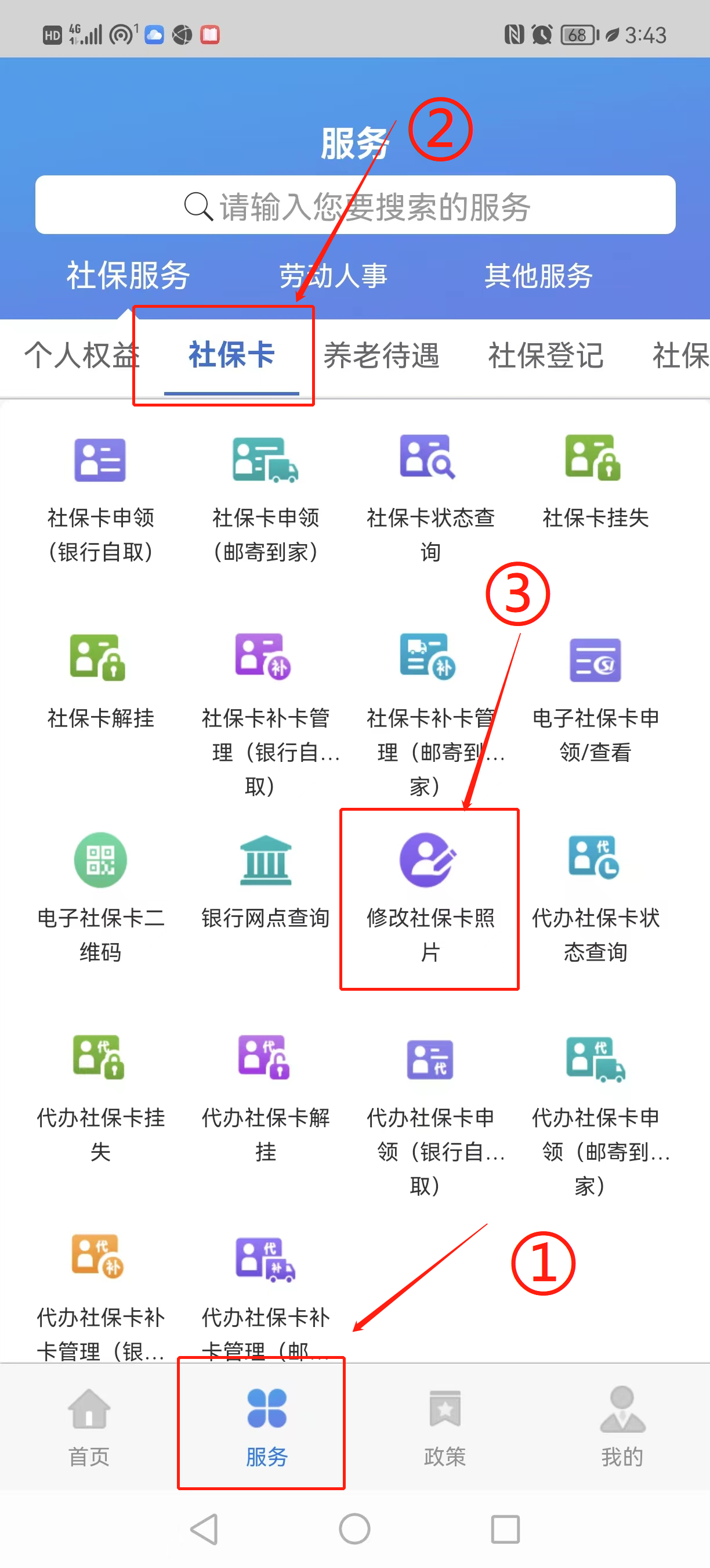 2、进入APP后,点击下方菜单栏“服务”,进入后再找到“社保卡”,在社保卡模块下找到“修改社保卡照片”;