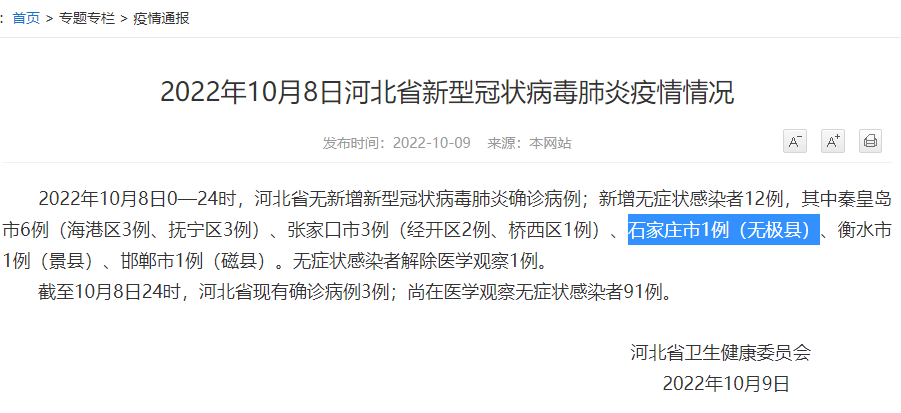 2022年10月8日0—24时,石家庄市无极县新增1例无症状感染者。