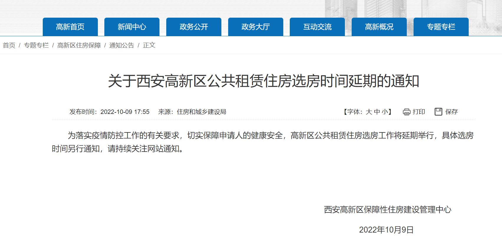 2022年10月西安高新公租房选房延期通知