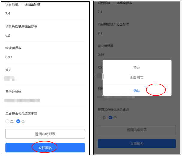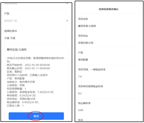 4. 在报名列表中,选择需要报名的房源,点击“报名”进入确认报名页面,核对信息是否正确,如已确认信息无误,点击“确认”理解报名即可完成报名。