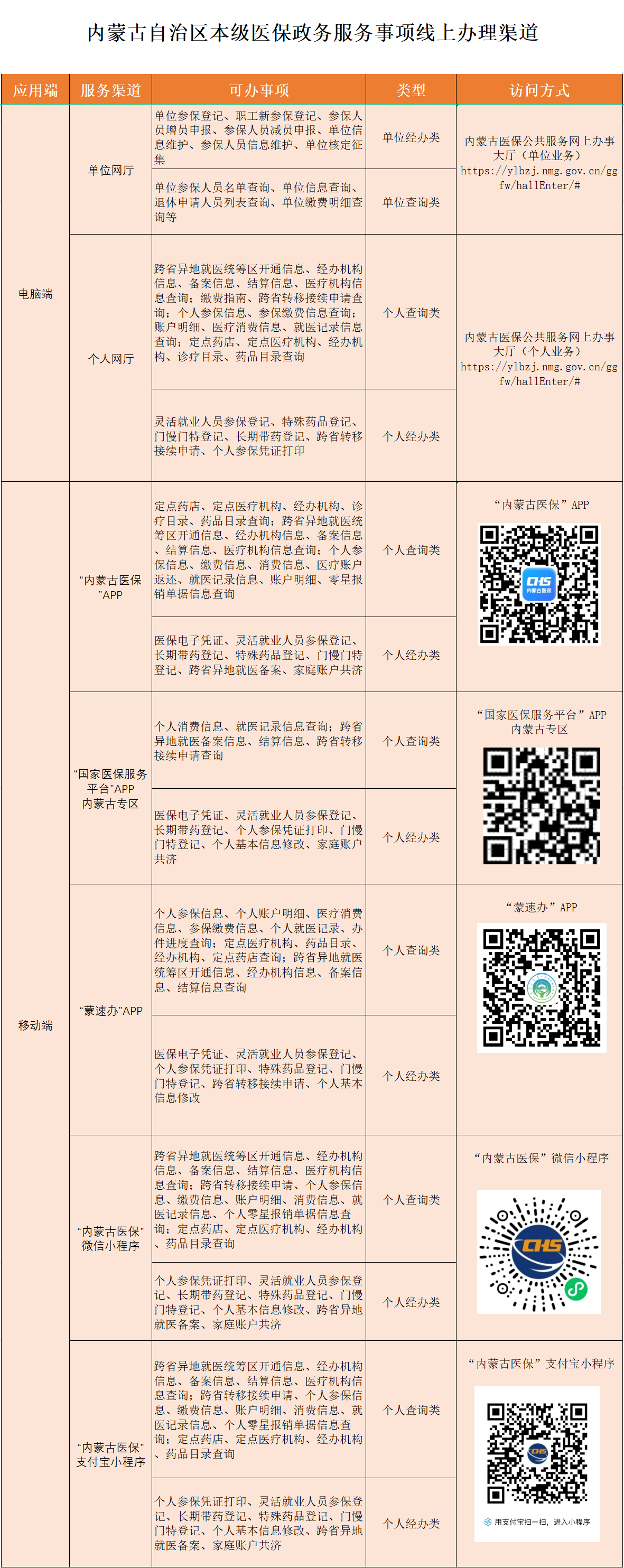 (一)窗口线下服务暂停期间,参保单位和人员可以通过“内蒙古医保公共服务”网上办事大厅和“内蒙古医保”APP、“蒙速办”APP、“国家医保服务平台”APP地方专区、“内蒙古医保”微信小程序、支付宝小程序等线上服务渠道进行“网办”事项的查询、申报和办理(详见附件)。“网办”事项审核将在窗口线下办公恢复后及时开展。