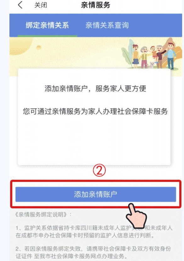 监护关系依据省持卡库四川籍未成年人监护关系和未成年人在成都市申办社会保障卡时预留的监护人信息进行判断。若因亲情服务绑定失败,请携带社会保障卡及双方有效身份证件至我市社会保障卡服务网点办理业务。