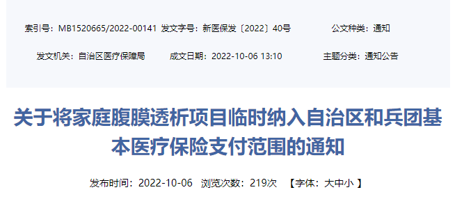 疫情防控期间乌鲁木齐家庭腹膜透析项目临时纳入医保支付范围