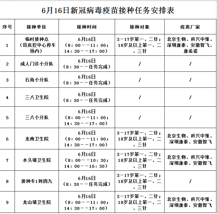 6月16日,佛冈县开放新冠病毒疫苗接种门诊有: