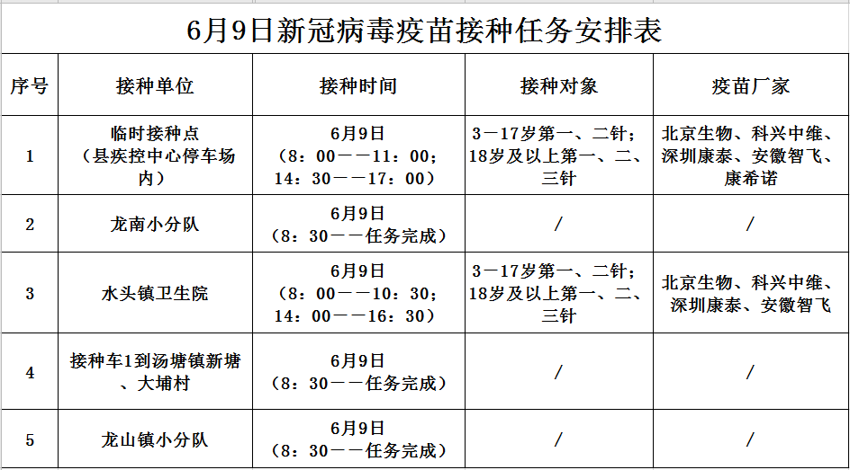 2022年6月9日,清新城区及山塘镇、太平镇、龙颈镇、禾云镇、浸潭镇开放3周岁及以上人群新冠疫苗接种。