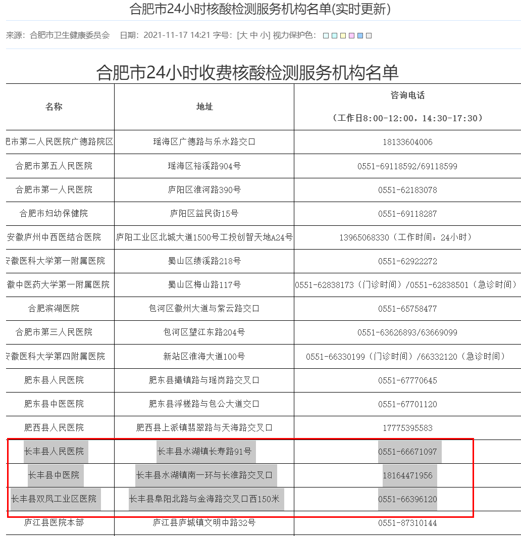 长丰县24小时核酸检测点有哪些 长丰县24小时核酸检测点有哪些地方