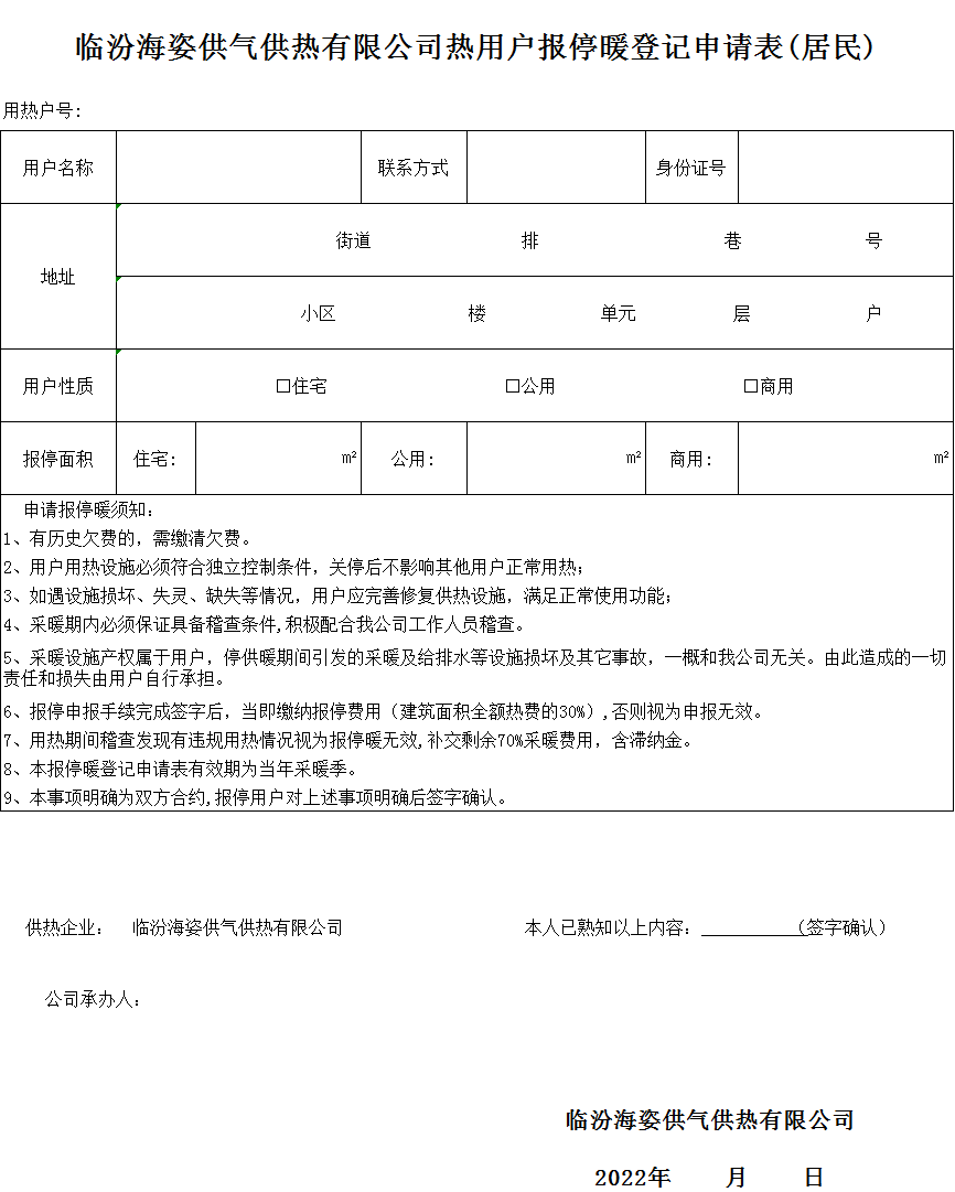 8、本 报停暖登记申请表有效期为当年采暖季。