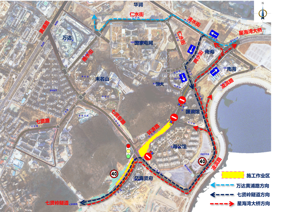 3.2022年10月10日0时,环涛路的仁水街至清水街路段,调整为一切车辆由西向东行驶的单行路,星海湾大桥西行下桥车辆只准右转进入清水街;清水街的环涛路至尚水街路段,调整为一切车辆由南向北行驶的单行路;尚水街的仁水街至清水街路段,调整为一切车辆由东向西行驶的单行路;仁水街的尚水街至环涛路路段,调整为一切车辆由北向南行驶的单行路。