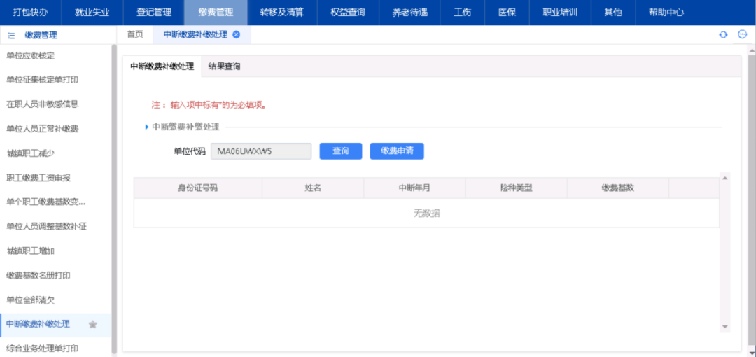 1、点击“缴费管理”-“中断缴费补缴处理”。系统展示单位中断记录。
