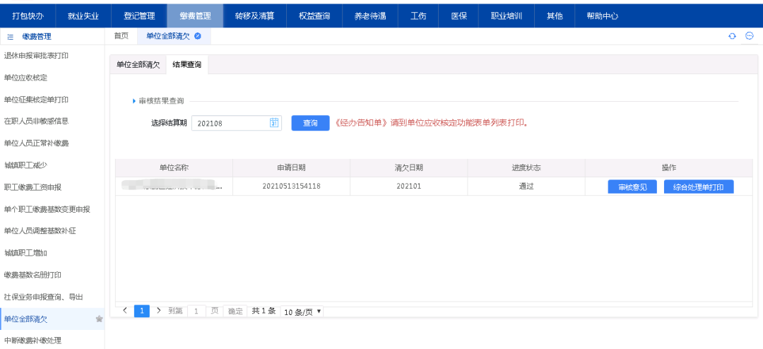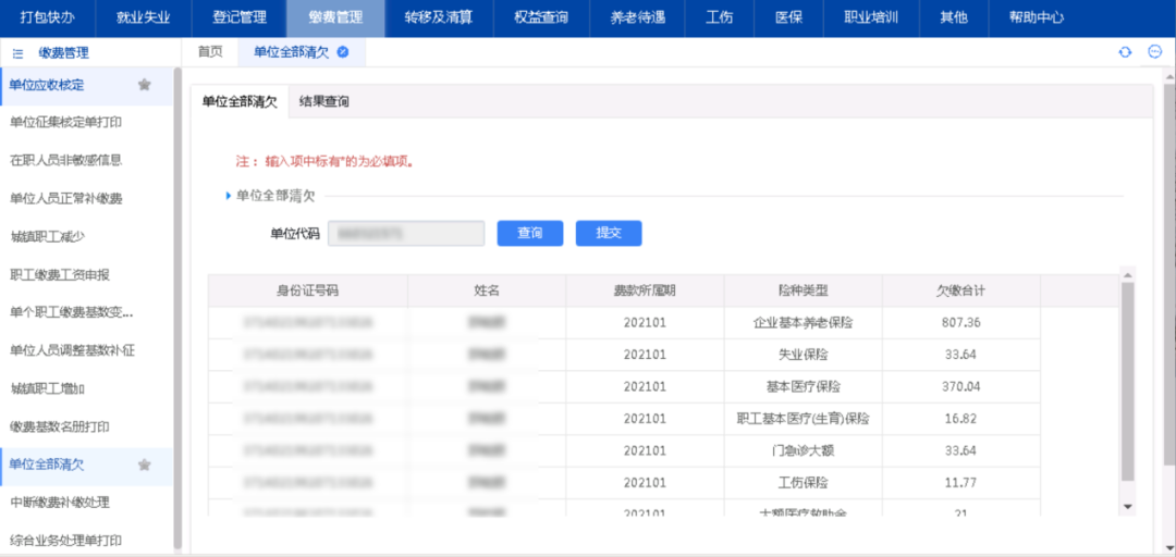 1、点击“缴费管理”-“单位全部清欠”。列表显示单位清欠信息。