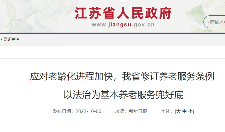 2022年9月29日,江苏省十三届人大常委会第三十二次会议审议通过了修订后的《江苏省养老服务条例》。此次修订重点围绕建设与经济社会发展水平相适应的基础性、普惠性、兜底性基本养老服务,强化重点老年困难群体养老保障,为居家社区养老提供制度支撑。