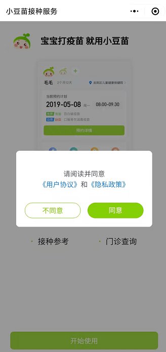 第一步:进入小程序后点击“开始使用”,选择“同意”。