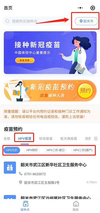 第二步:定位在韶关市,在“疫苗预约”一栏点击“HPV疫苗”,选择Hpv疫苗接种种类,再根据自身远近距离方便程度,选择合适的社区医院。
