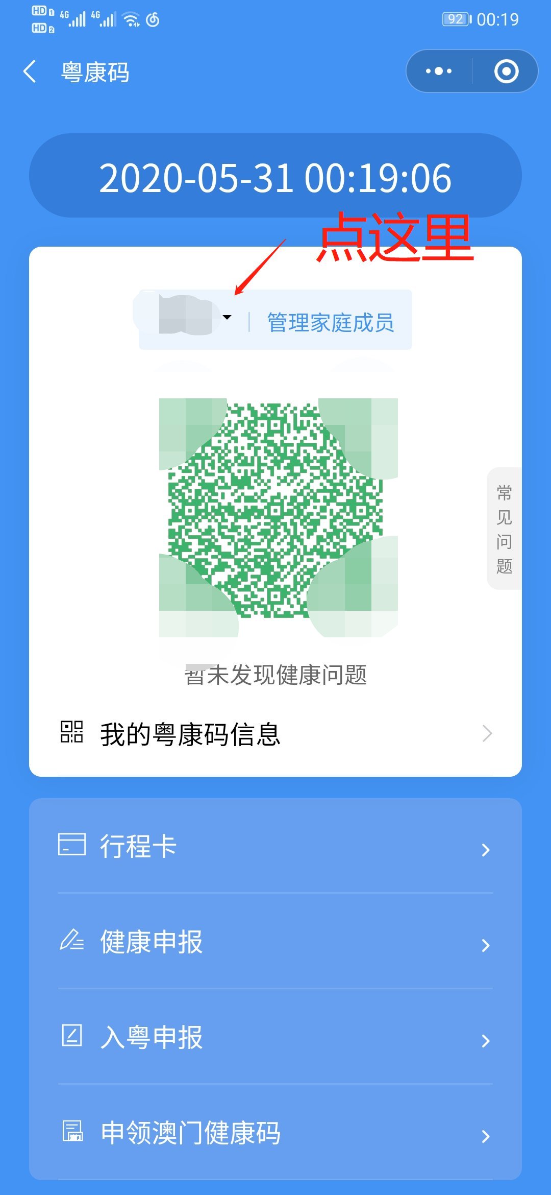 如果需要出示亲属的粤康码,只需点击下图所示的地方即可