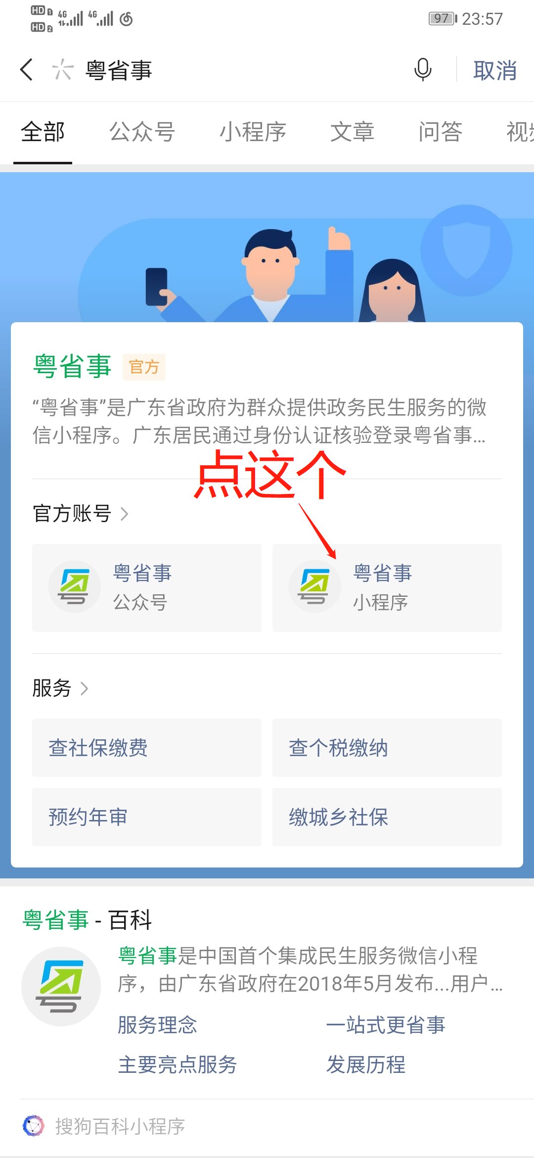 首先在微信搜索“粤省事”,点击“粤省事”小程序(点击进入)