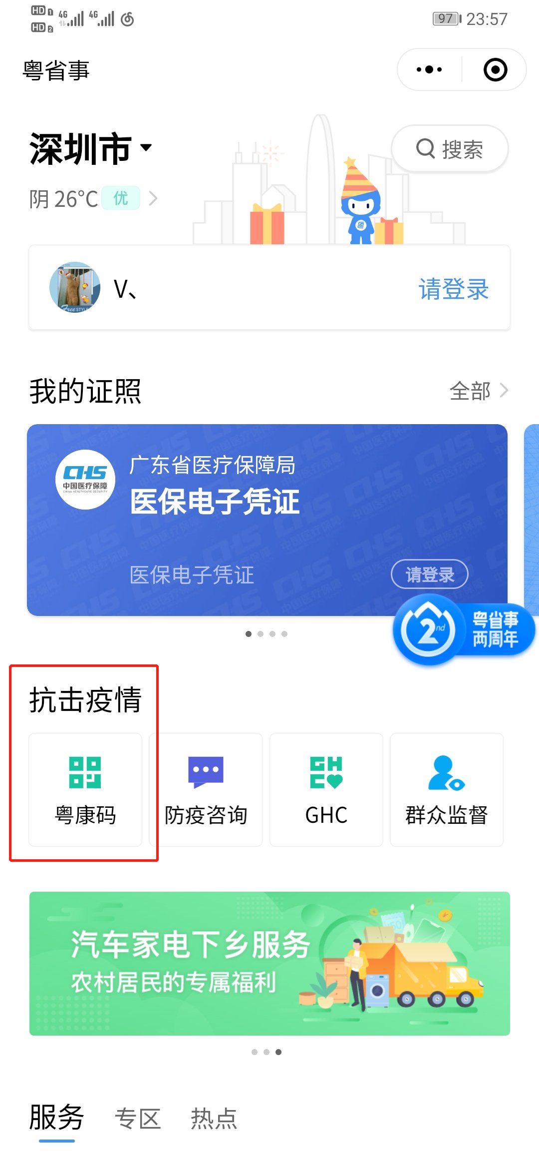 接着在首页“抗击疫情”点击“粤康码”,随后会要求你进行登录验证,按照提示操作即可。